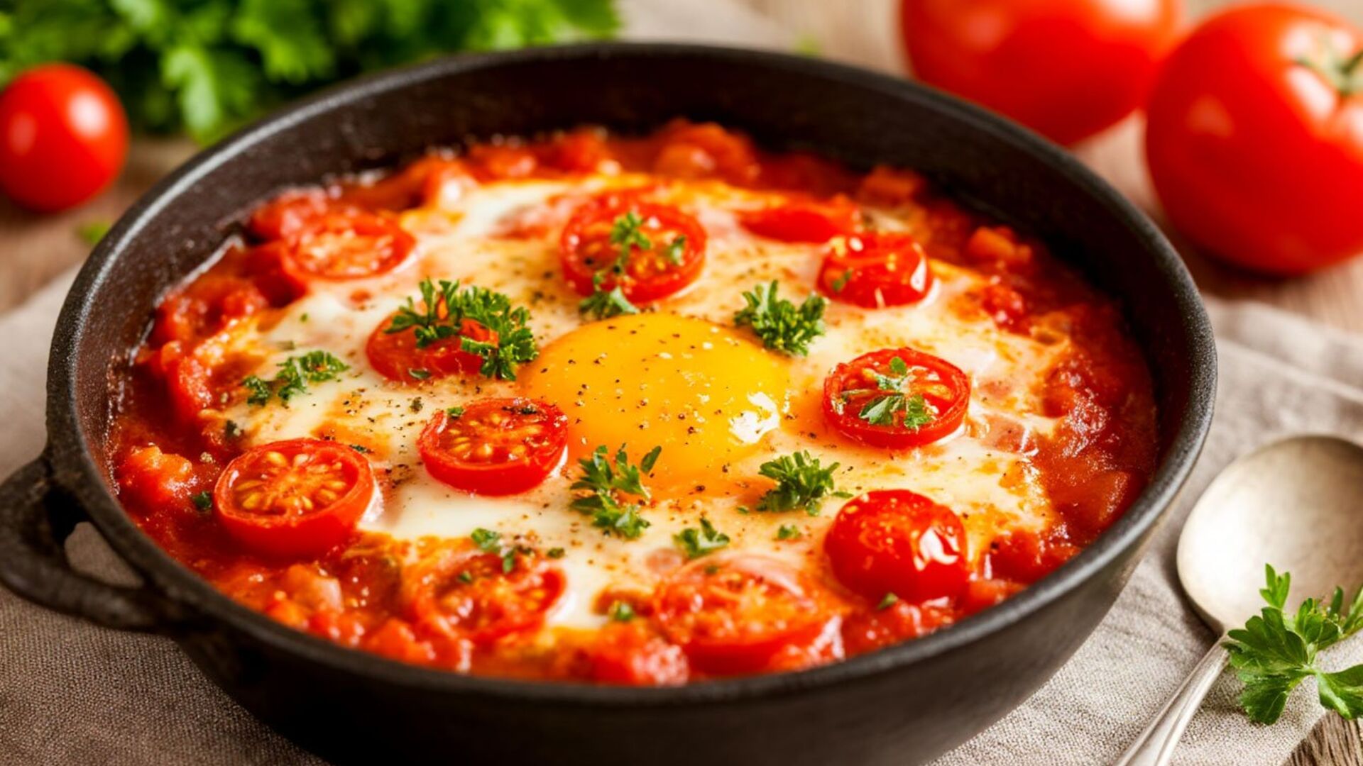 На разогретой сковороде я прогреваю масло, добавляю мелко нарезанный лук и чеснок и даю им стать мягкими и ароматными. Затем кладу нарезанные помидоры, специи, вливаю воду и томлю соус до густоты. В горячей массе делаю небольшие углубления, аккуратно разбиваю туда яйца, накрываю крышкой и довожу до желаемой готовности, после чего посыпаю зеленью и подаю прямо со сковороды.
