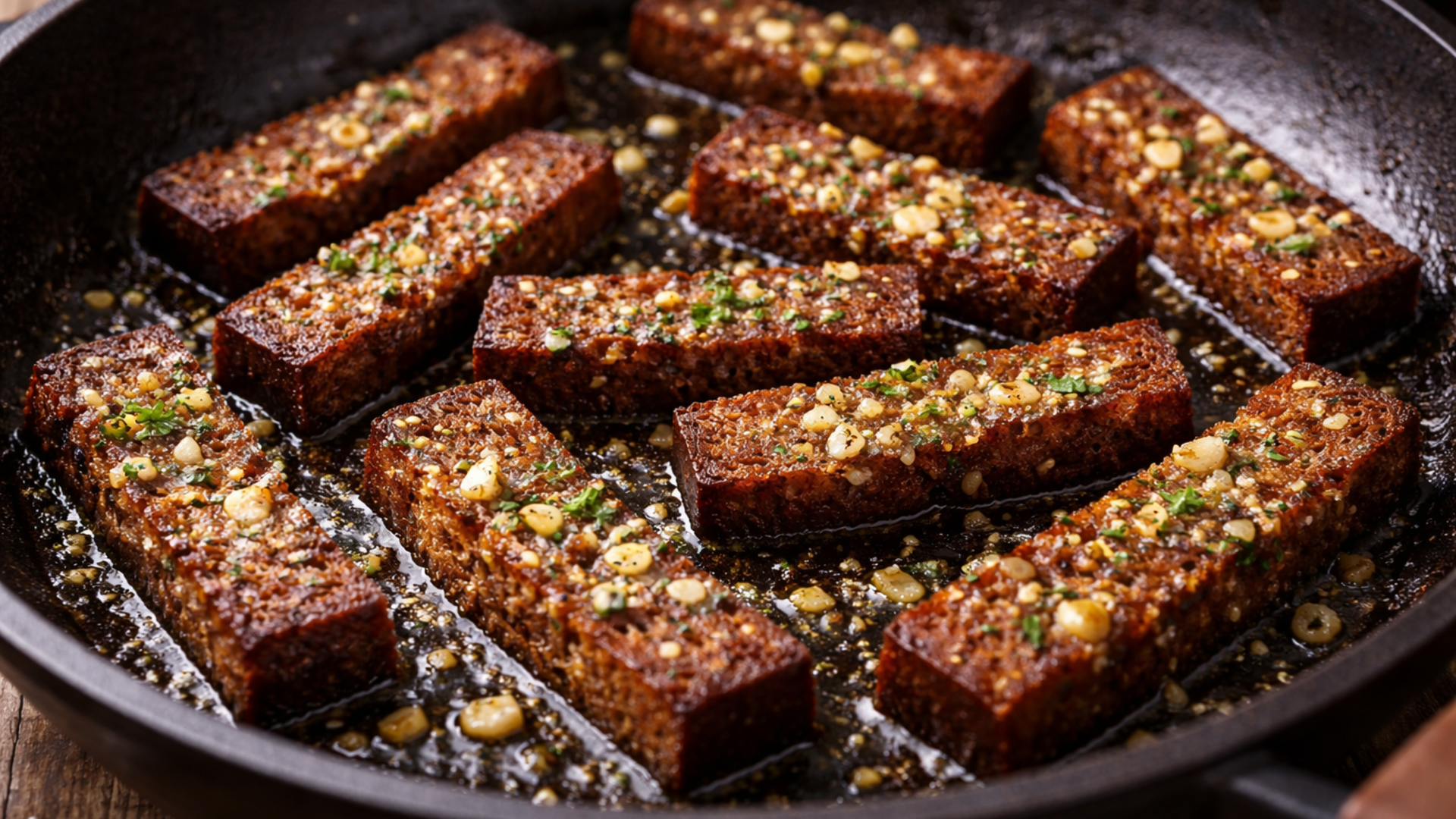 Хлеб я нарезаю аккуратными брусочками, чеснок пропускаю через пресс и смешиваю с маслом, солью и специями. Полученной смесью тщательно смазываю каждый кусочек и выкладываю их на разогретую сковороду. Обжариваю гренки на среднем огне до румяной корочки с обеих сторон, затем перекладываю на бумажное полотенце. Подаю закуску еще теплой, когда аромат чеснока особенно яркий.