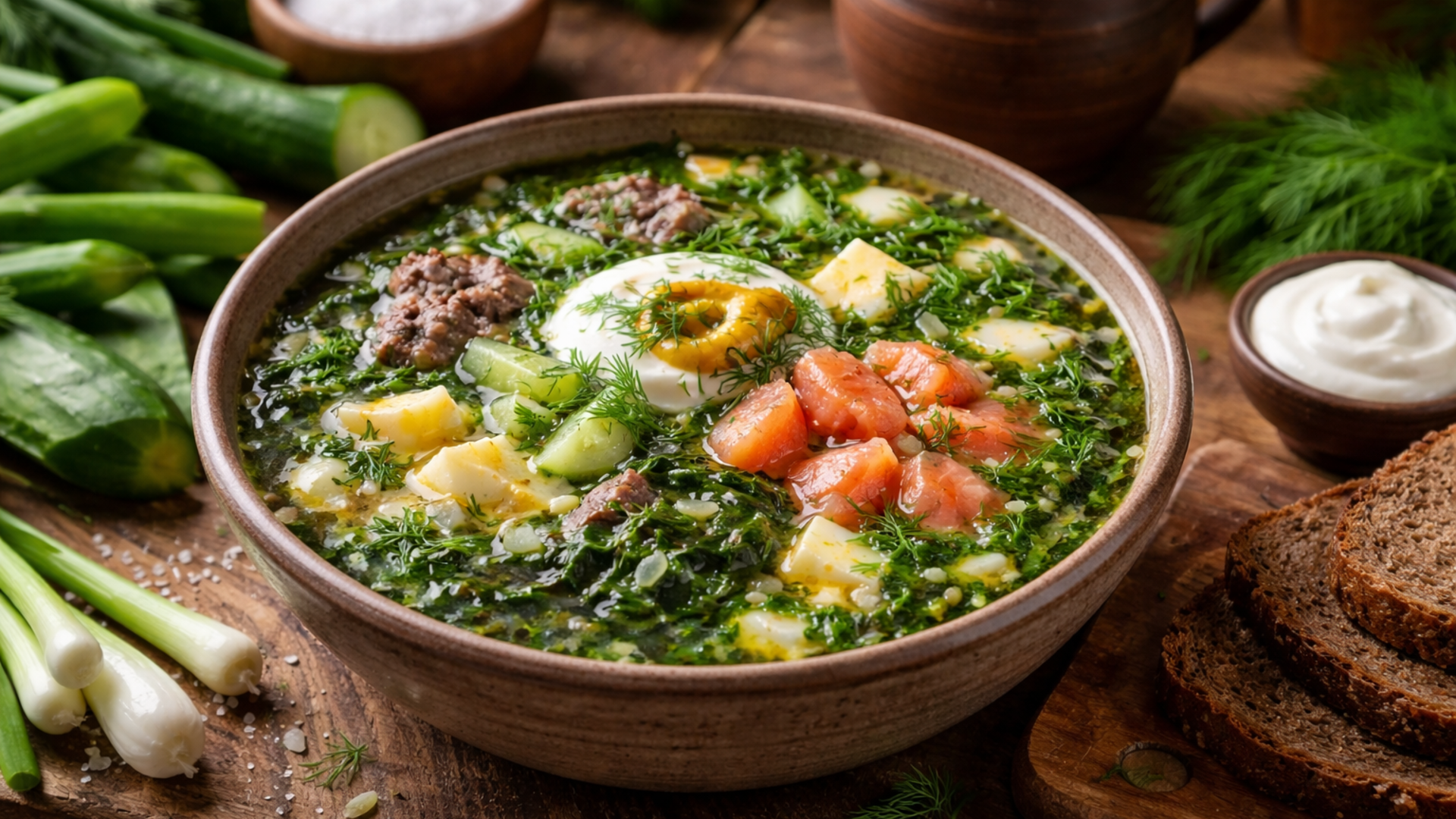 Для приготовления я беру 500 мл хлебного кваса, 200 г отварной говядины, 150 г филе слабосоленой рыбы, 200 г щавеля, 100 г шпината, 2 свежих огурца, 2 куриных яйца, 3 столовые ложки сметаны, 1 чайную ложку горчицы, половину чайной ложки соли и пучок укропа и зеленого лука.