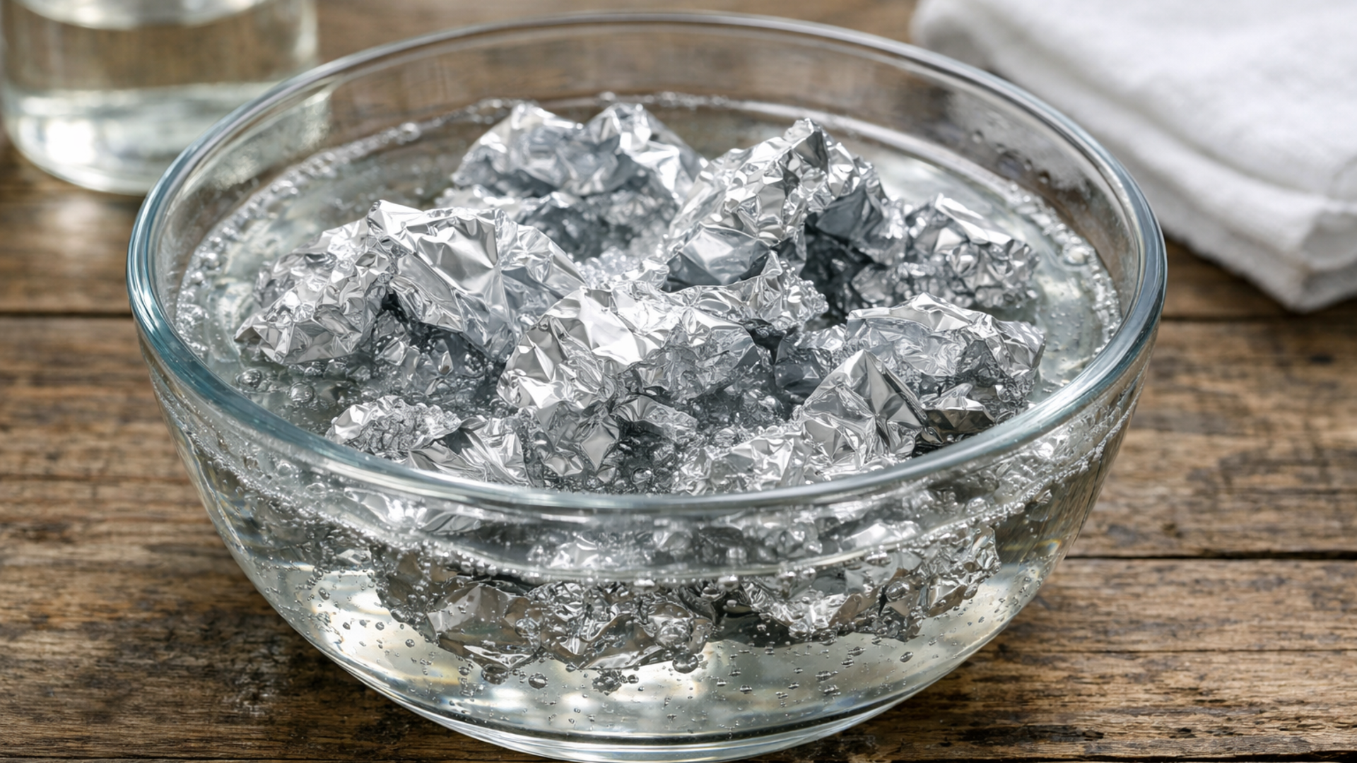 Нужно всего ничего — обычная пищевая фольга, примерно 30 см, а также 100 мл девятипроцентного столового уксуса. А еще понадобится миска с теплой водой, примерно 200 мл.