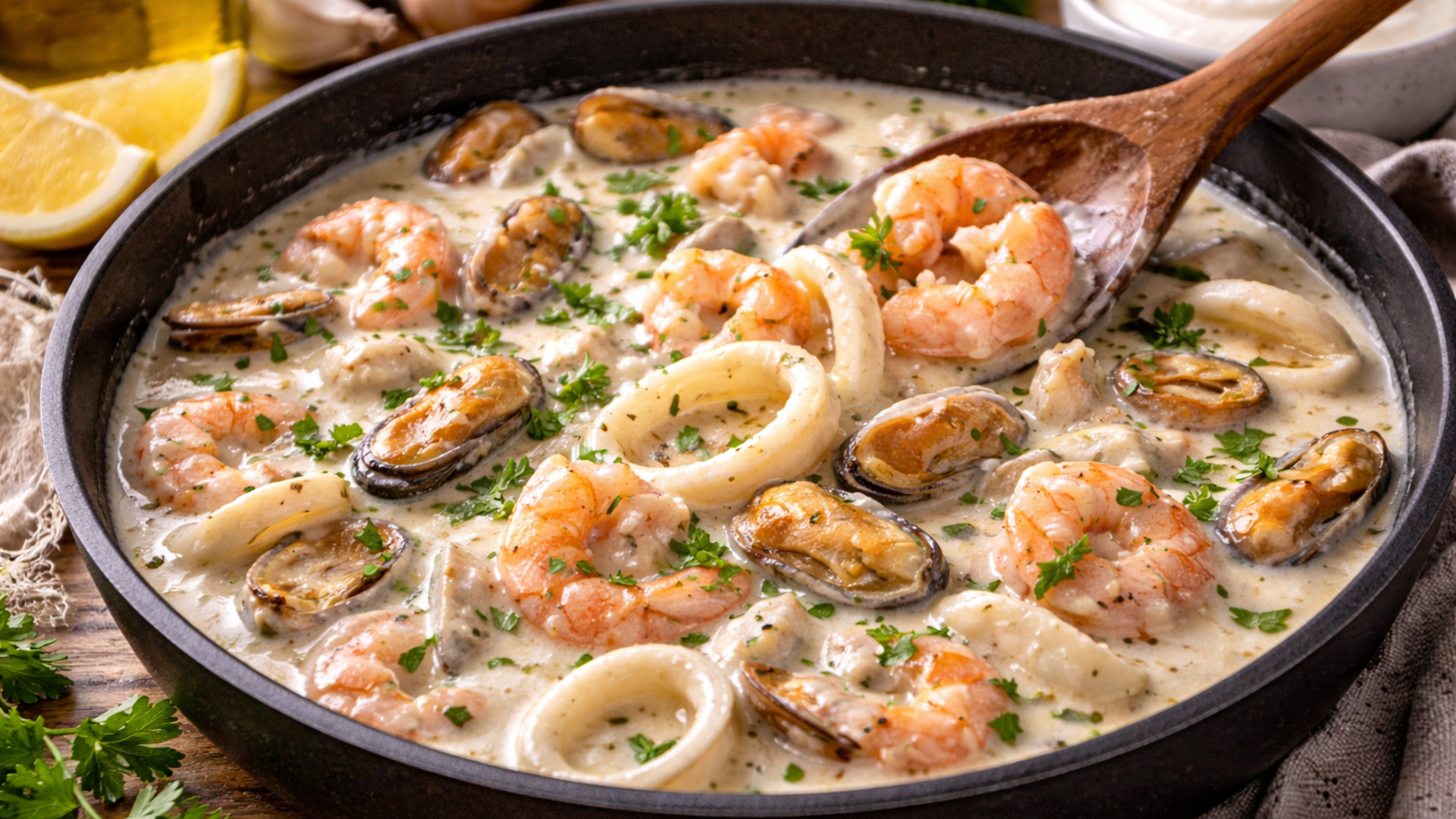Морепродукты в сметанном соусе — удачный вариант, когда хочется приготовить что-то нежное, но без сложных рецептов. Блюдо получается легким, ароматным и при этом достаточно сытным. Сметанный соус мягко подчеркивает вкус морепродуктов и делает их особенно сочными.