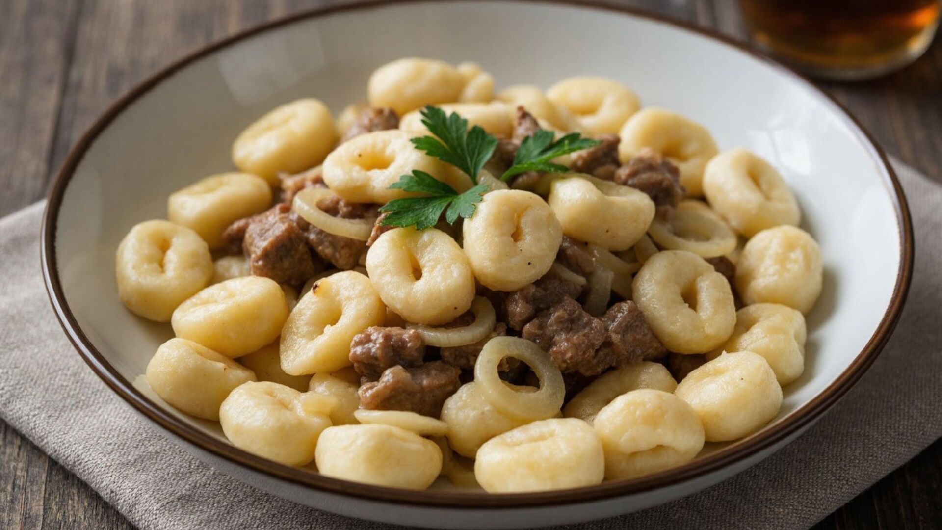 Фарш обжаривают с мелко нарезанным луком до румяности, слегка подсаливают и перчат. Из яйца, воды, соли и муки замешивают мягкое тесто. Его делят на небольшие кусочки и отваривают в подсоленной воде до готовности. Горячие галушки соединяют с мясной зажаркой, аккуратно перемешивают и подают со сливочным маслом. Блюдо получается ароматным, сытным и по-домашнему вкусным.