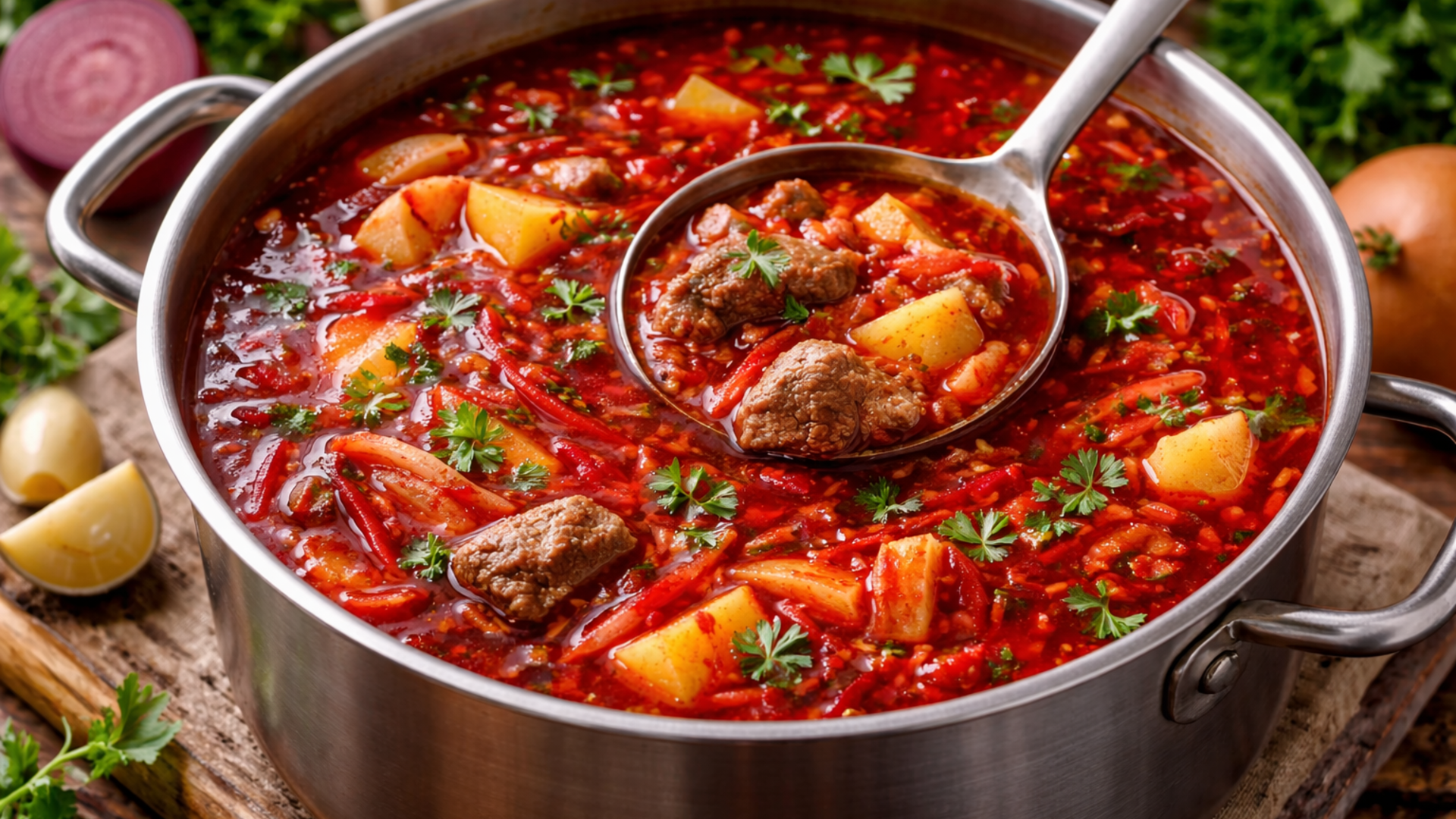 Борщ — это не просто суп, а настоящее домашнее удовольствие, знакомое многим с детства. Его насыщенный цвет и аромат сразу создают ощущение уюта, а вкус становится только лучше на следующий день. У каждой хозяйки есть свои хитрости, но базовый вариант всегда остается беспроигрышным.