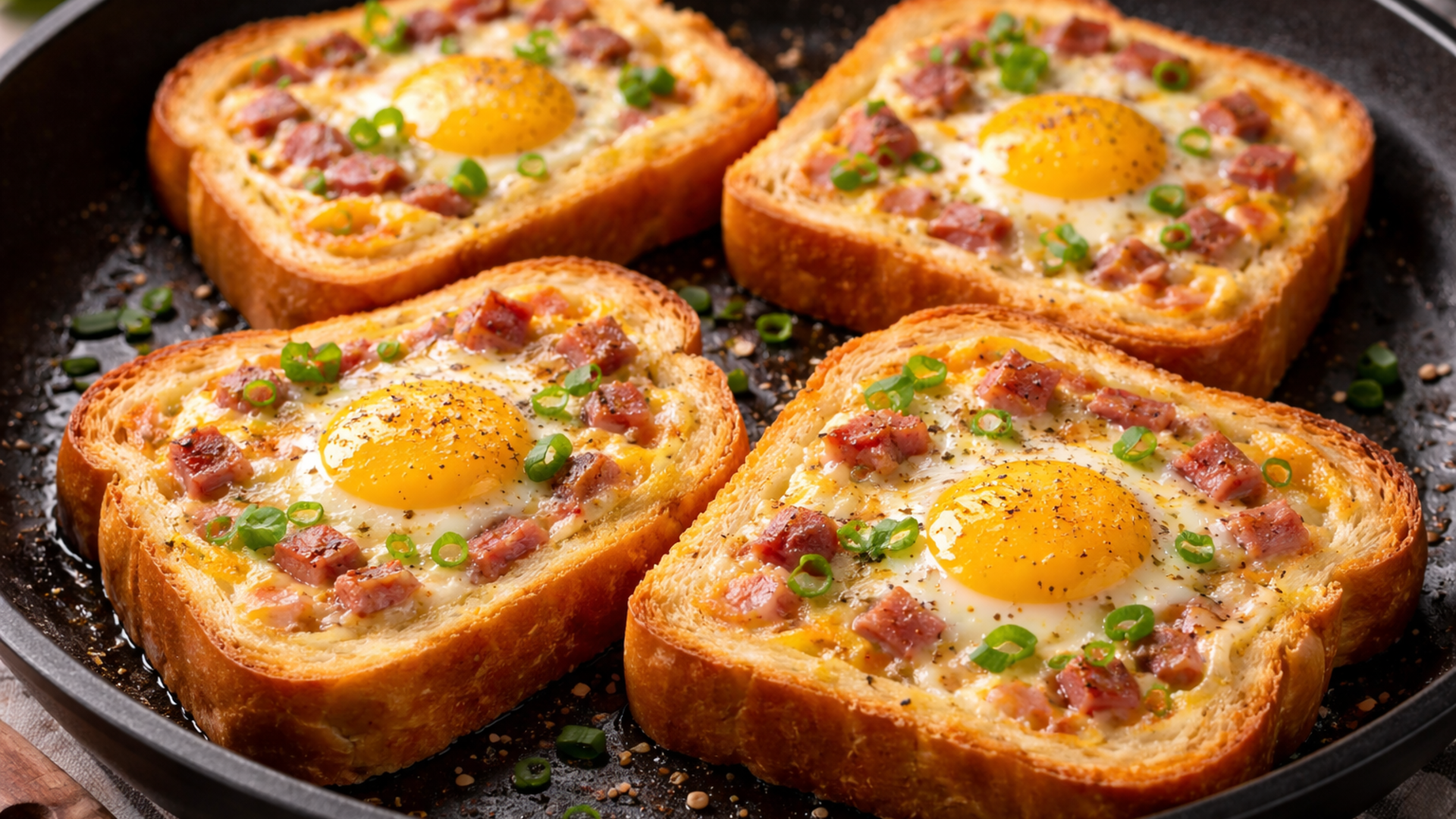 В ломтиках хлеба аккуратно вырезаю середину, оставляя бортики. На сковороде растапливаю сливочное масло, выкладываю хлеб и слегка подрумяниваю с одной стороны. Затем переворачиваю, в каждое отверстие вбиваю по яйцу, подсаливаю, добавляю мелко нарезанную колбасу и посыпаю тертым сыром. Готовлю под крышкой на слабом огне, пока белок не схватится, а сыр не расплавится. Подаю сразу, пока блюдо горячее и ароматное.