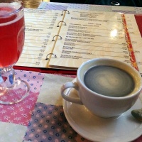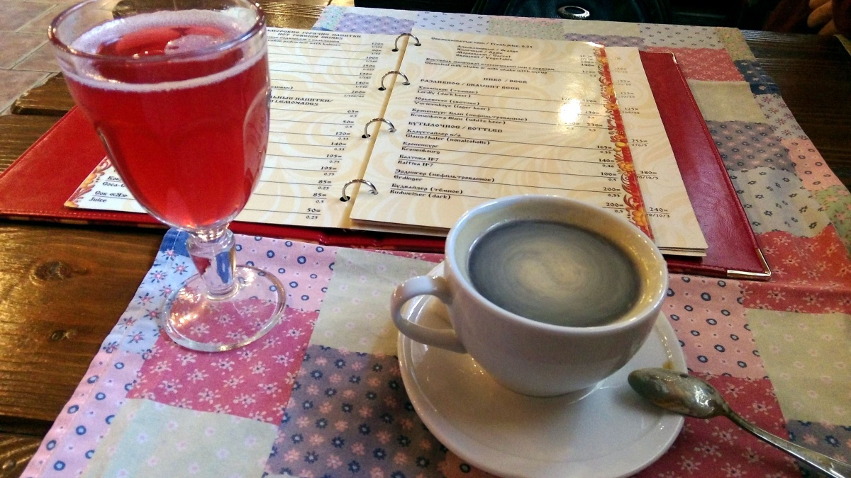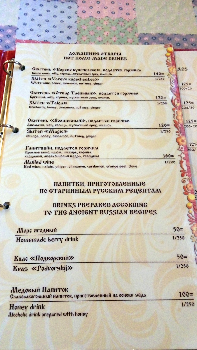 Напитки самодельные дешевы. Сбитни 120-140 руб., морс легкий и квас суровый 50. Пиво «Юрьевское» и «Хозяйское», варят не на месте, заказное, 130-150 - очень лёгкое, очень, в традиции советских сортов. А вот кофе не сами делают, в Новгороде не растет - эспрессо 90, чая в меню нет вообще, перье 140 малышка. Ну, логично же.