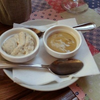 «Хлебовая» - «Щи из чёрного крошева со свининкой по старинному новгородскому рецепту сваренные. Подаются в горшочке с ржаной шапкою запеченною» (250 руб.) - легкие, слишком легкие щи. Просто удивительно «современные». Фитнес-щи. Не «бедные», нет, вкус приятный, но неожиданно легки. Это, наверное, хорошо, но правда как-то пропадает сразу. Мелко нашинкованной свинины не мало, но участие ее, снижено до крайности.